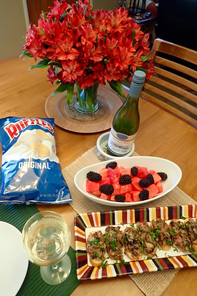 I offered to cancel today’s get together because standing up and making an appetizer seemed like too difficult a task. But Merrilyn said to come anyway – hurray! And I did bring something (the Ruffles, not the fruit) to go with Merrilyn’s Crostini with mushrooms, beef and brie.